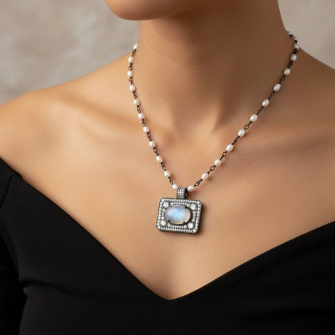 Amara Moonstone & White Topaz Rectangular Pendant – Rhodium Sterling Silver