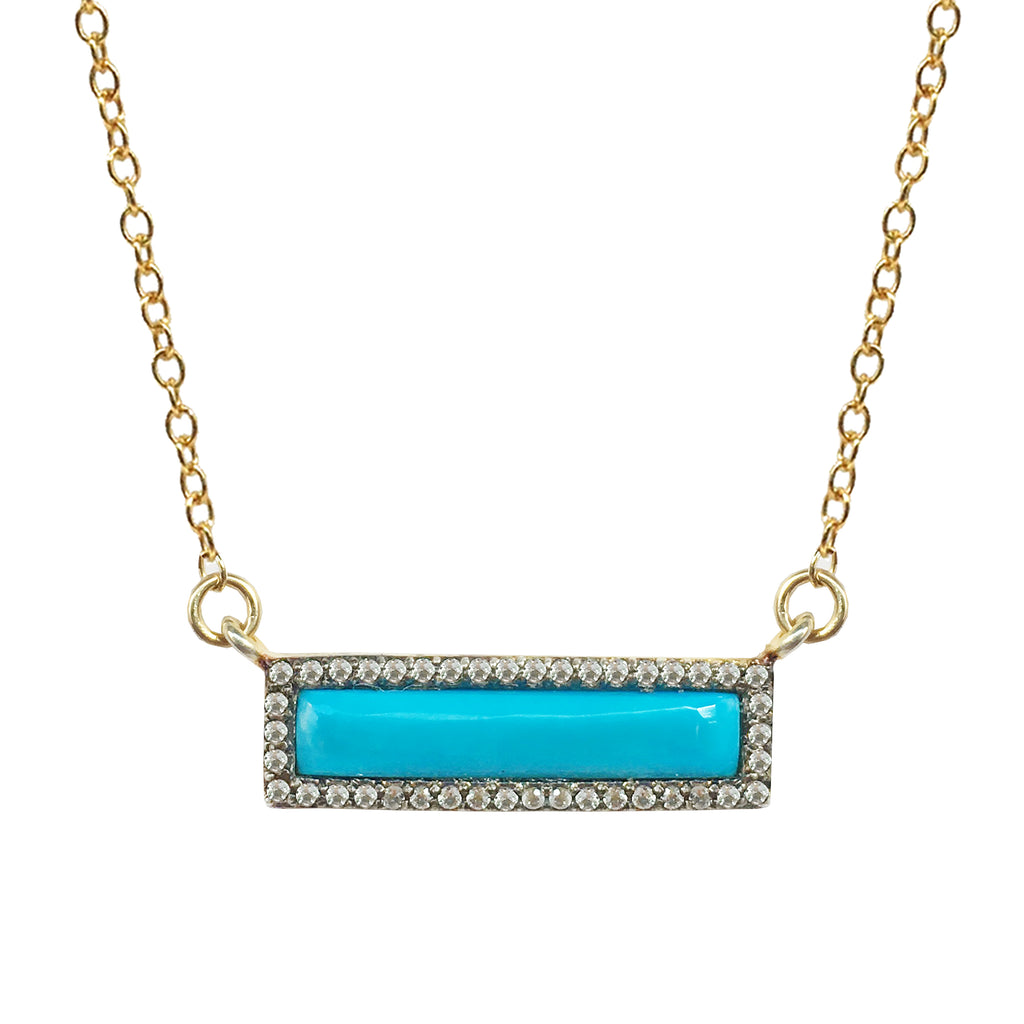 Elevate your style with this stunning turquoise bar necklace. Featuring a rectangular turquoise gemstone adorned with brilliant white topaz pavé that captures the sparkle of diamonds, this piece brings bohemian elegance to any outfit.