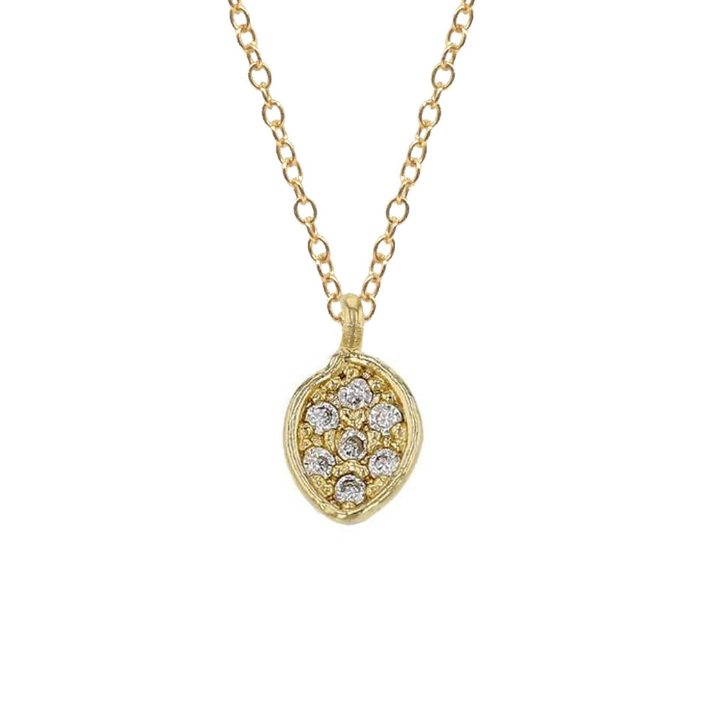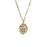 This necklace showcases a vermeil gold leaf charm adorned with cubic zirconia, measuring 6x4 mm, on a 16-inch gold-filled chain with an additional 1-inch adjustable extension.