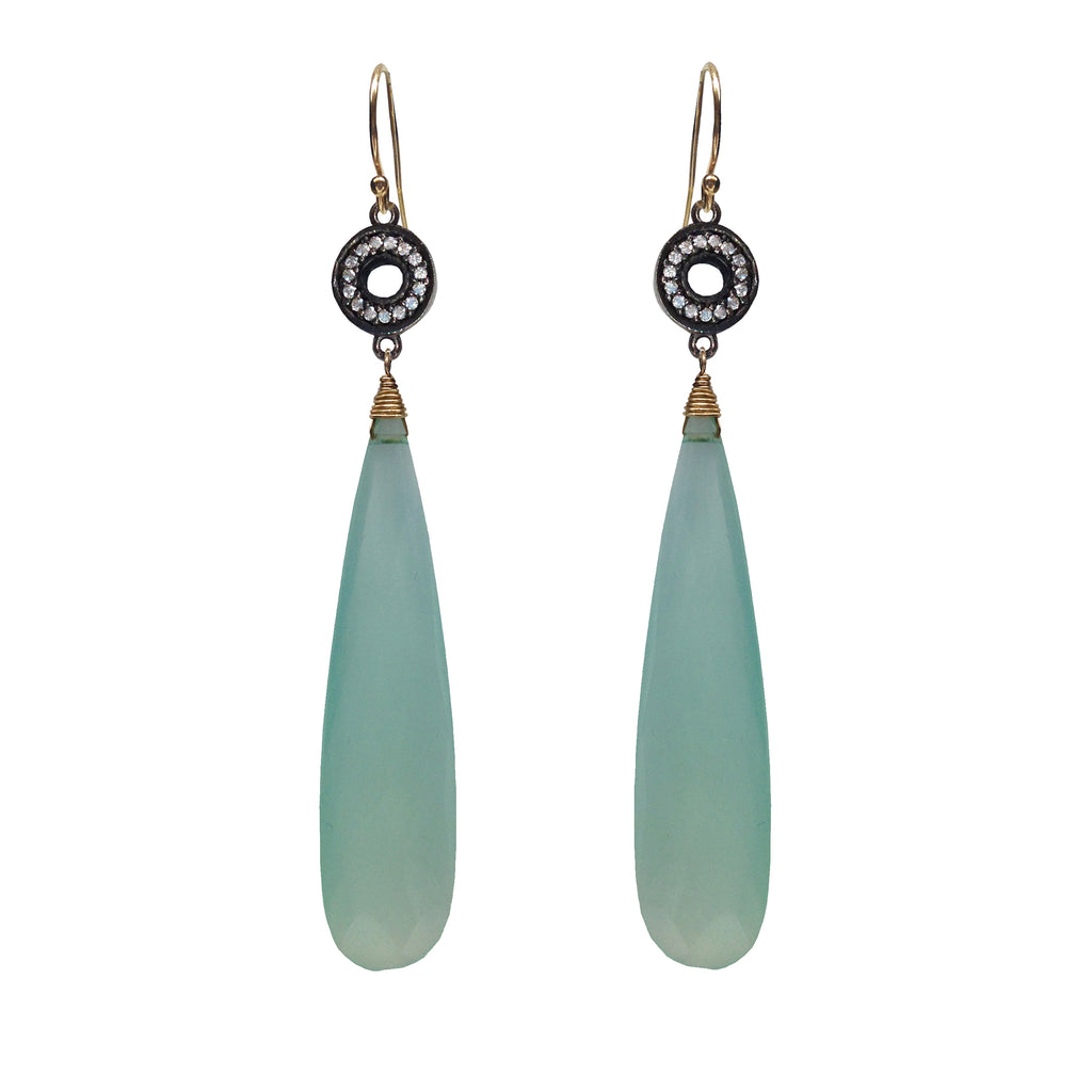 These Blue Green Sea Foam Chalcedony Gemstone Long Teardrop Dangle Earrings showcase teardrop-shaped aqua chalcedony stones wire-wrapped to an open round charm with pavé white topaz. Made from oxidized sterling silver with gold-filled ear wires, they offer a stylish, handcrafted design from Los Angeles.