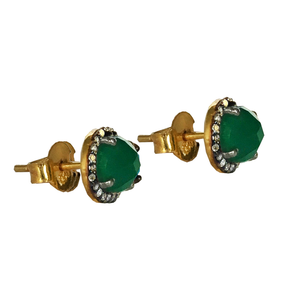 Green Onyx Diamond Halo Stud Earrings - Sterling Silver Gold Plated