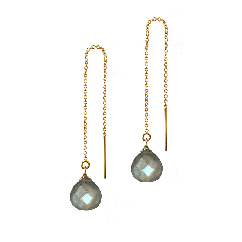These delicate dangle threader earrings showcase genuine 10mm x 10mm labradorite teardrop gemstones. Measuring approximately 2 inches in drop length, they are crafted in non-tarnish rhodium-plated sterling silver or gold-filled materials. Lightweight and hypoallergenic, they are designed for comfortable everyday wear.