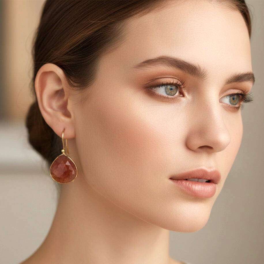 These stunning strawberry quartz earrings feature luminous 20mm x 20mm teardrop-shaped gemstones set in gold vermeil bezels. The soft warm red hue with natural inclusions creates a romantic, eye-catching look perfect for both everyday elegance and special occasions.