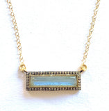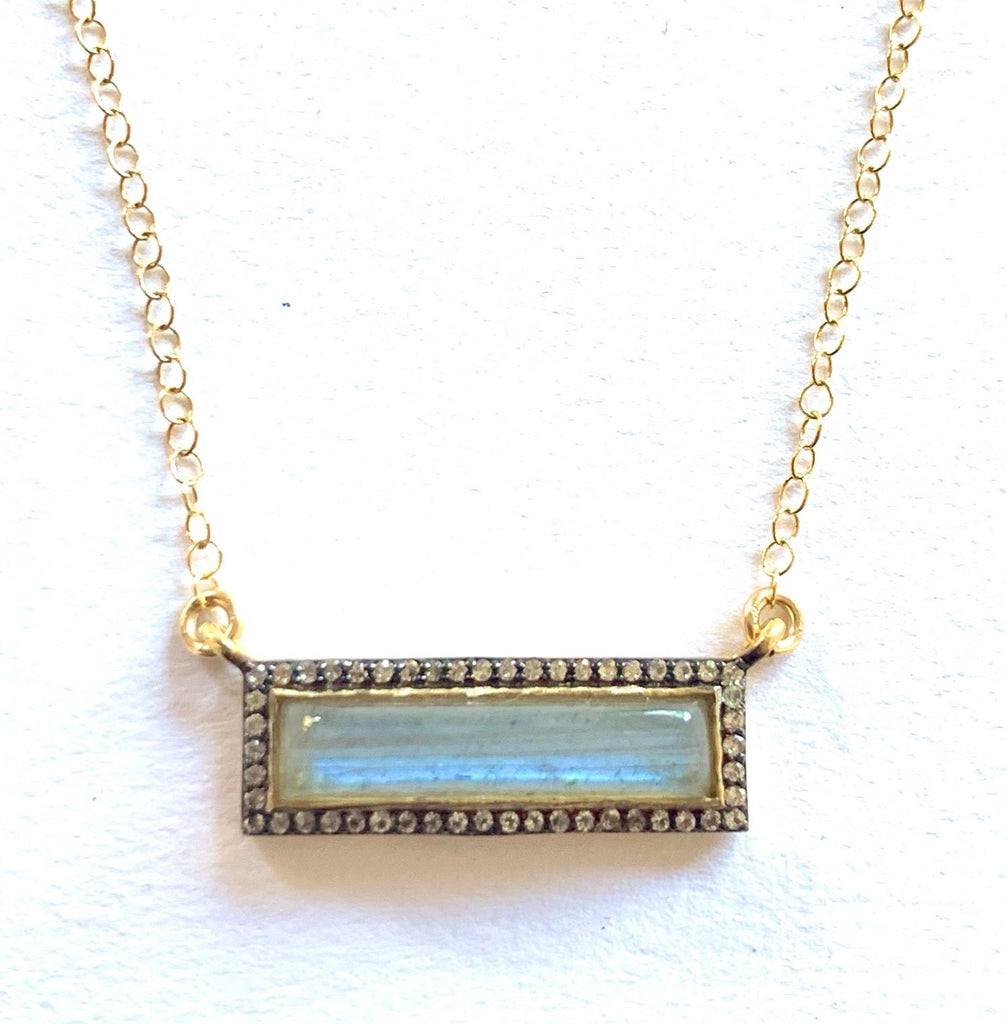 Elevate your everyday elegance with this delicate bar necklace featuring a luminous labradorite gemstone enhanced by sparkling white topaz pavé. Paired with a gold-filled chain, it’s the perfect as a layering piece—or a standout on its own.