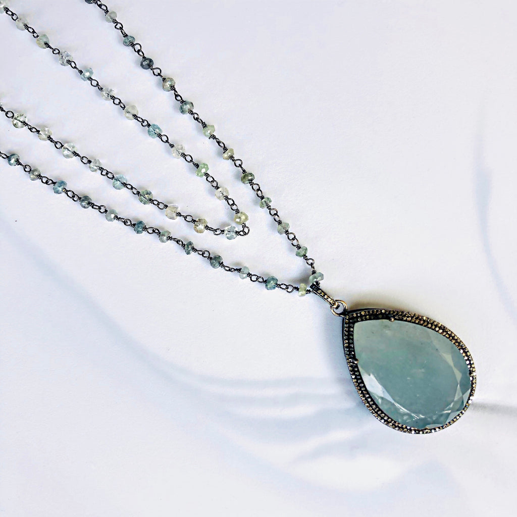 Moss Aquamarine Necklace with Double Row Pave Diamond and Diamond Bale