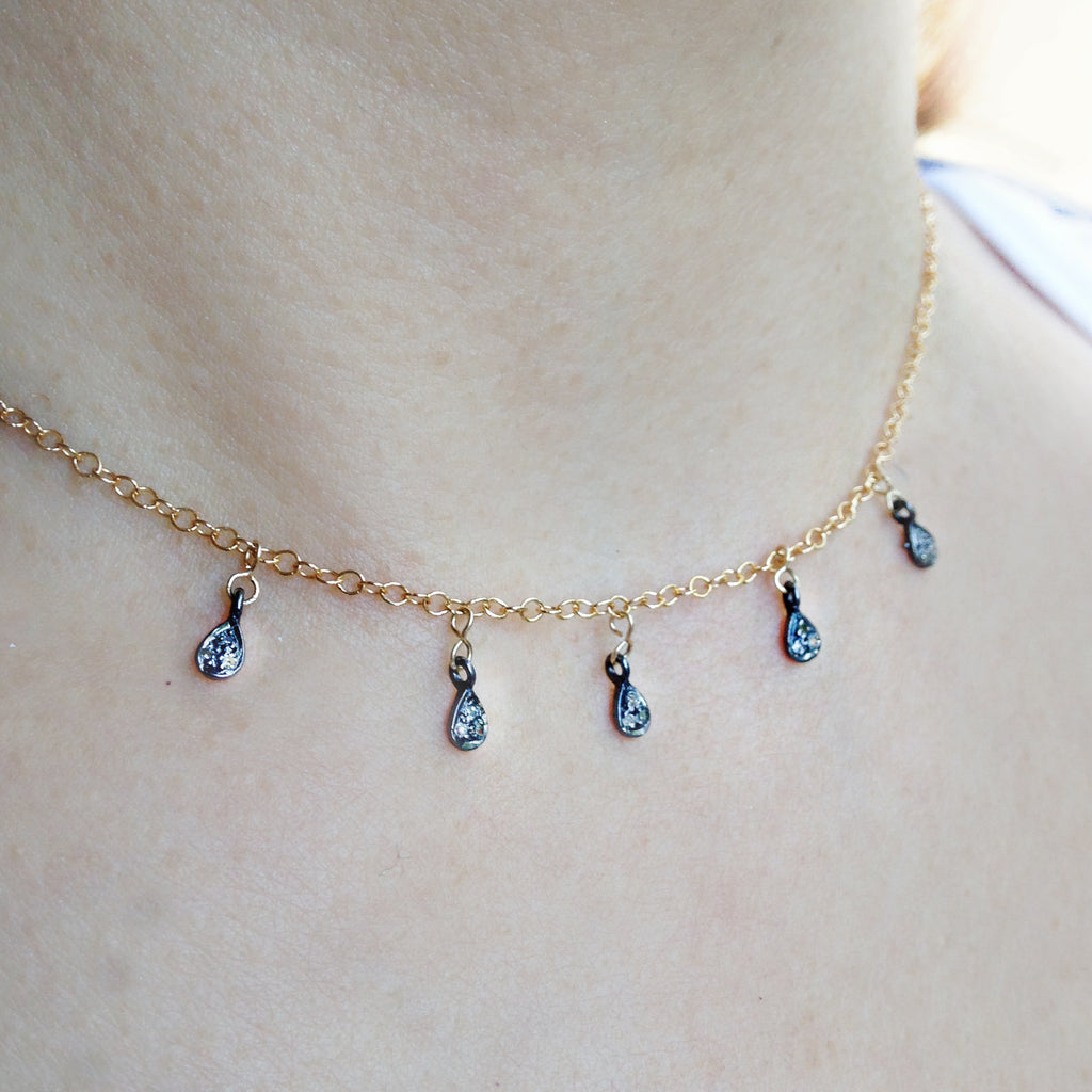 Handcrafted in Los Angeles, this delicate necklace features diamond pavé teardrop charms in oxidized sterling silver with hand wire wrapping. The 14-inch gold-filled chain includes a 2-inch extension, making it ideal for wearing alone or layering. Customization options are available.
