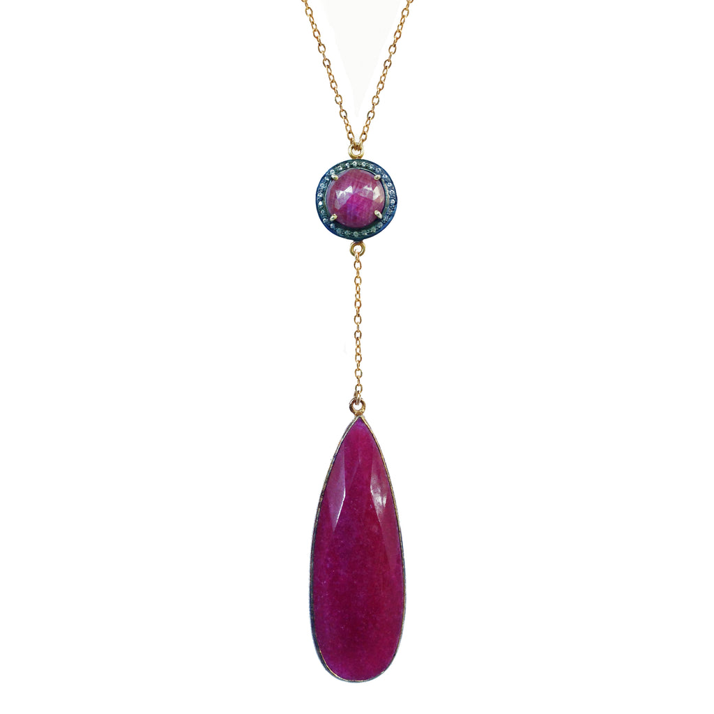 This lariat necklace features a red ruby teardrop with a round ruby pavé set alongside white topaz in sterling silver. The 3 3/4” pendant hangs on a 16-inch gold-filled chain with a 2-inch adjustable extension. It blends classic and bohemian styles for versatile wear.