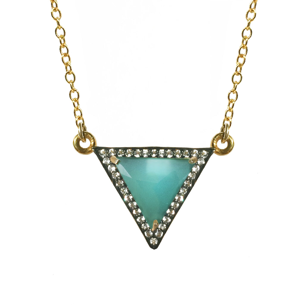 Discover the serene beauty of our handcrafted triangle necklace featuring luminous blue-green chalcedony and sparkling white topaz pavé set in sterling silver.